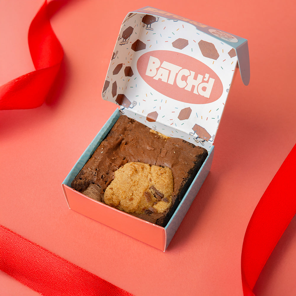 Delight in the indulgence of our Singular Letterbox Brownie, crafted with rich, gooey Belgian chocolate and loaded with generous chunks of chocolate chips. Swirled with pools of salted caramel and topped with caramel chocolate buttons, this brownie is a perfect balance of sweetness and decadence, delivered straight to your door.