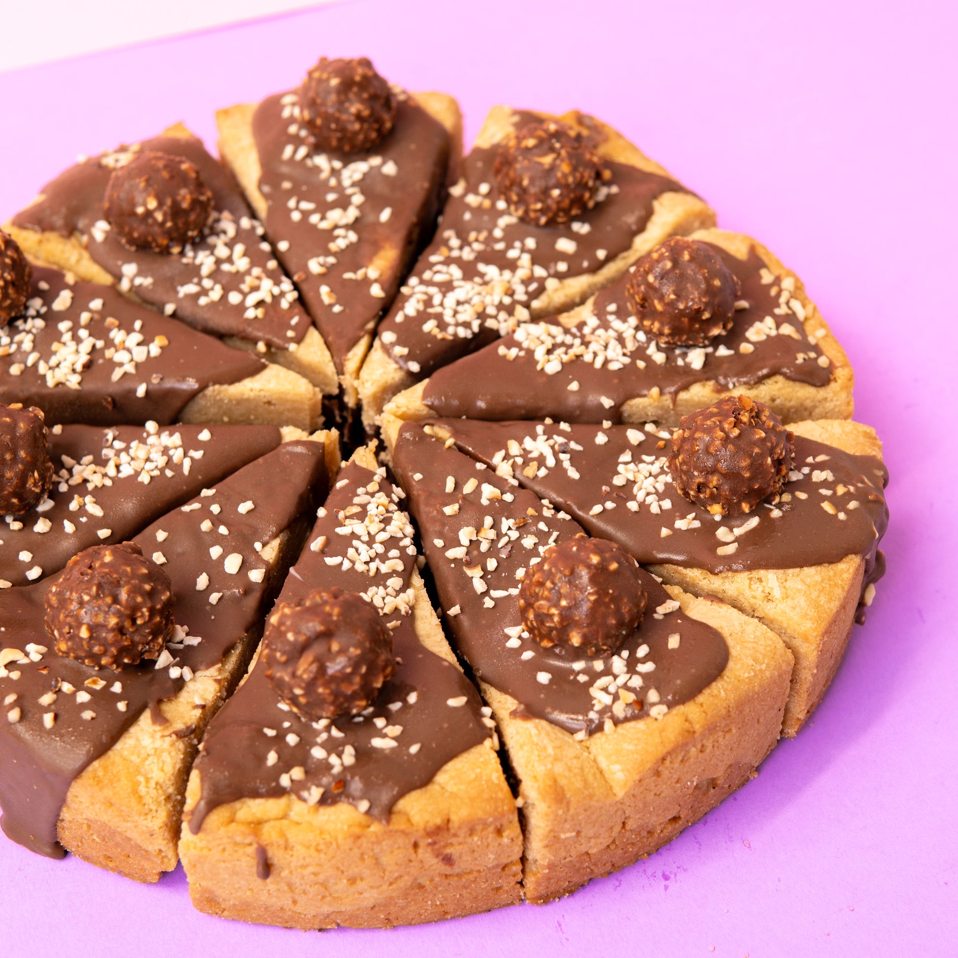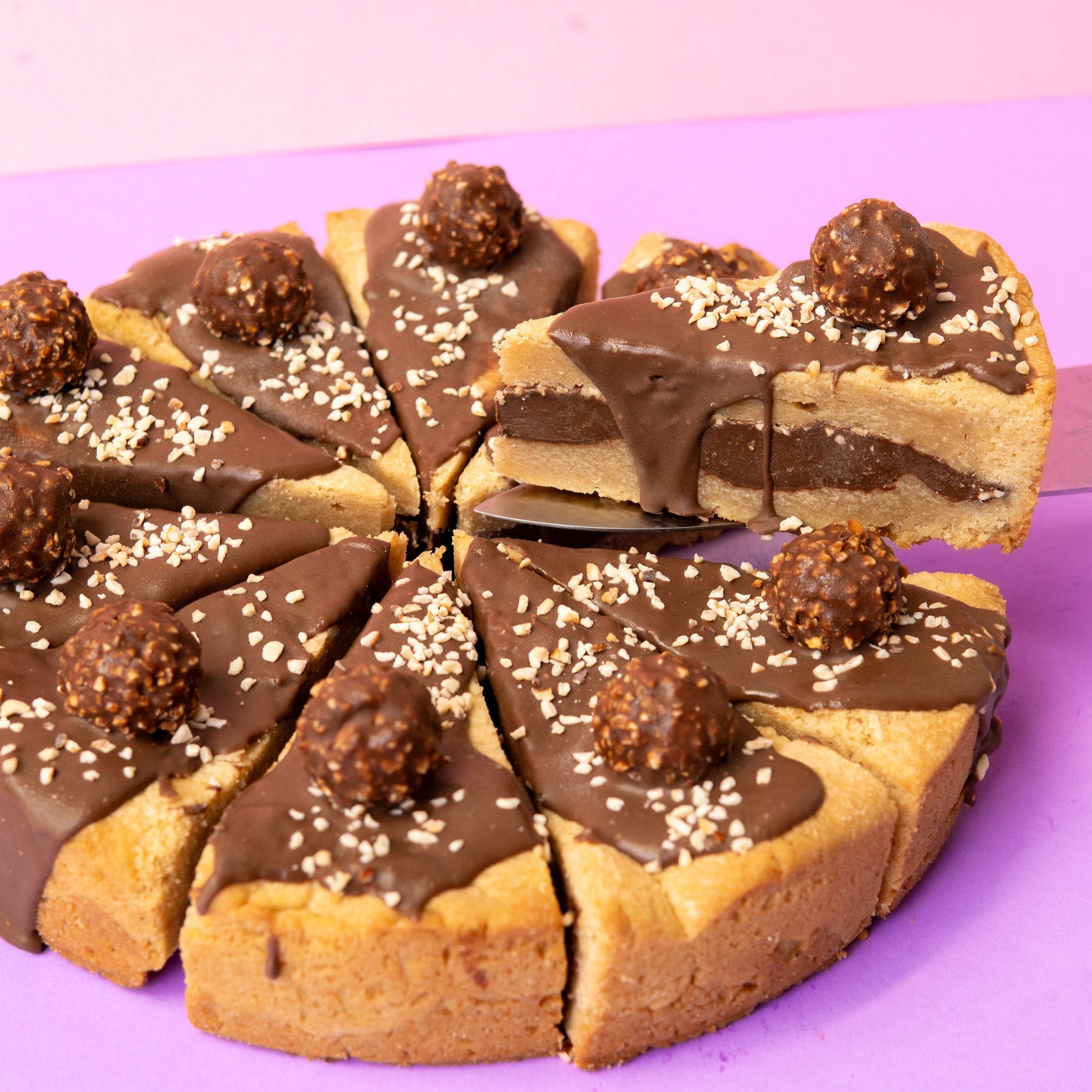 Indulge in the ultimate dessert experience with our Full Ferrero Rocher Cookie Pie. This decadent treat features ten generous slices of rich, buttery cookie pie, each filled with luscious chocolate hazelnut spread and finely diced hazelnuts.