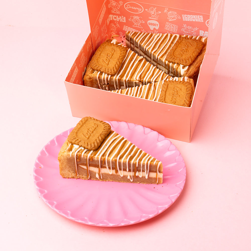 A deliciously indulgent box of OG Biscuit Cookie Pies, each filled with a rich caramelised biscuit and white chocolate sauce, then drizzled with more sweet white chocolate and finished with a crunchy Biscoff® biscuit on top. Perfect for sharing or gifting, these cookie pies are a treat for any biscuit lover.