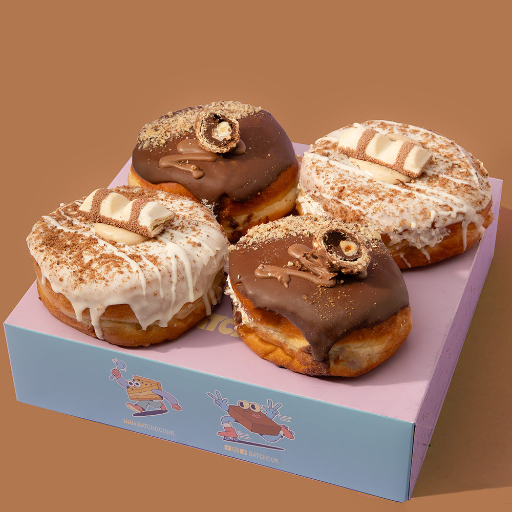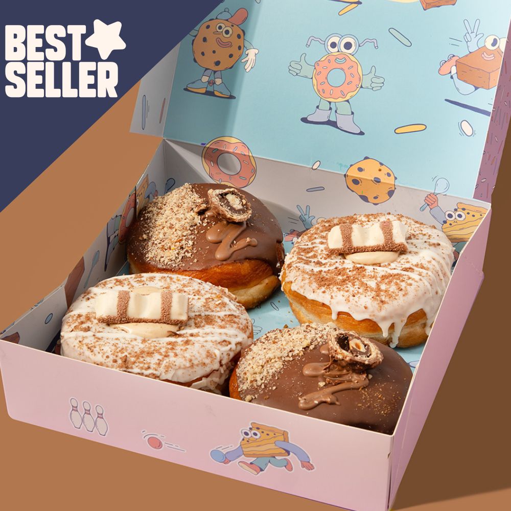 Our delightful Hazelnut 4-box is perfect for hazelnut lovers and doughnut enthusiasts alike! This box includes two incredible hazelnut flavours. First, the Kinder Bueno doughnut: filled with whipping cream, coated in rich chocolate, and topped with pieces of Bueno. Then, there’s the Ferrero Rocher doughnut: packed with hazelnut whipping cream, dipped in smooth milk chocolate, and finished with hazelnuts and a Ferrero.