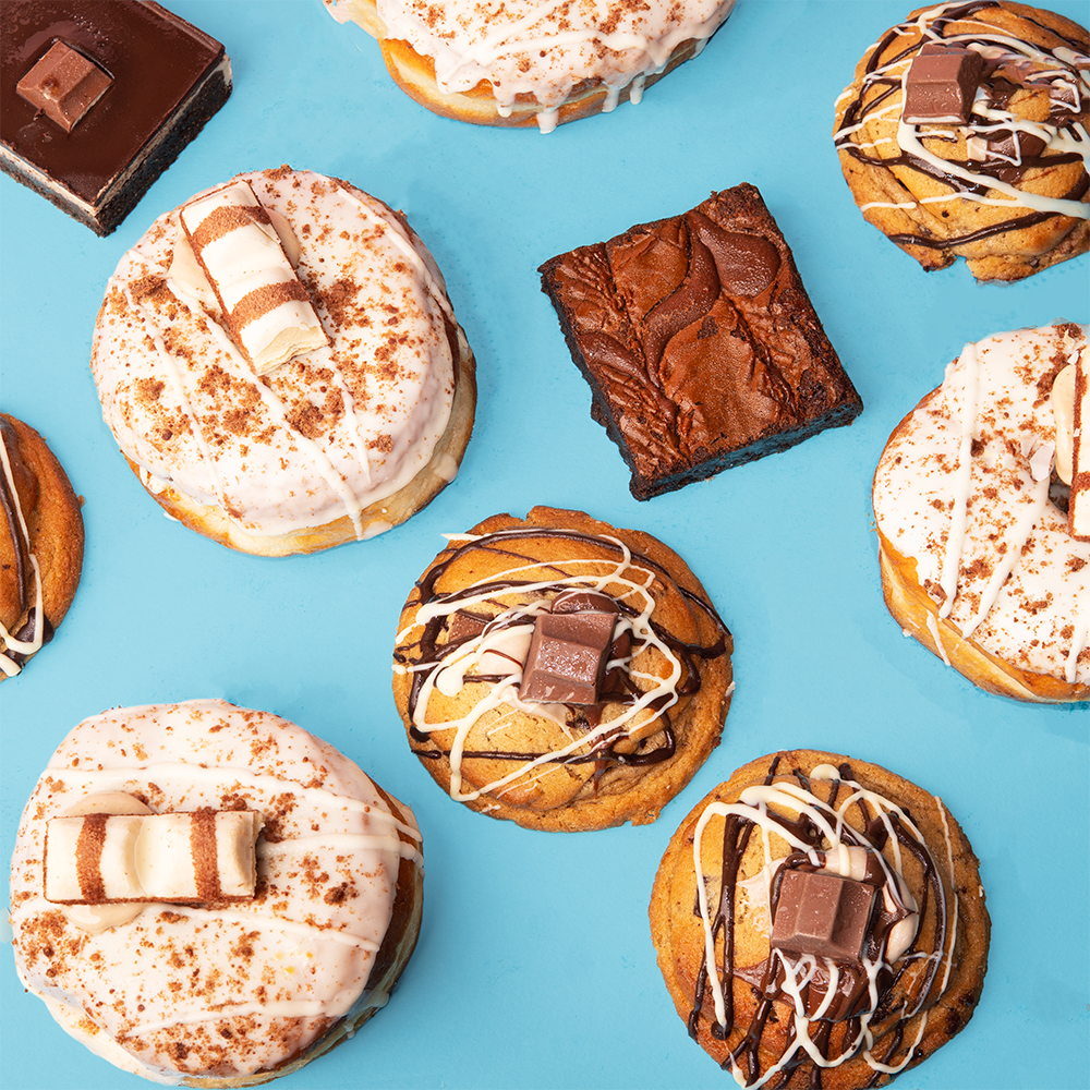 This irresistible box starts with four of our best selling NYC cookies. Two are loaded with Belgian chocolate chips, and two are filled with a gooey hazelnut centre and topped with Kinder pieces. Each one is thick, chewy and packed with indulgent flavour.  The feast continues with a box of four Bueno donuts, filled with soft whipping cream and finished with a white chocolate, hazelnut sauce and a piece of Kinder Bueno for that perfect crunch.  You’ll also receive two rich Belgian chocolate brownies. One is layered with Kinder chocolate, and the other is finished with a generous swirl of Nutella. To top it off, there’s a Nutella and Kinder cookie pie, packed with creamy hazelnut spread and topped with chunks of Kinder chocolate.  Perfect for sharing or enjoying solo, this bundle is a dream for any hazelnut lover.
