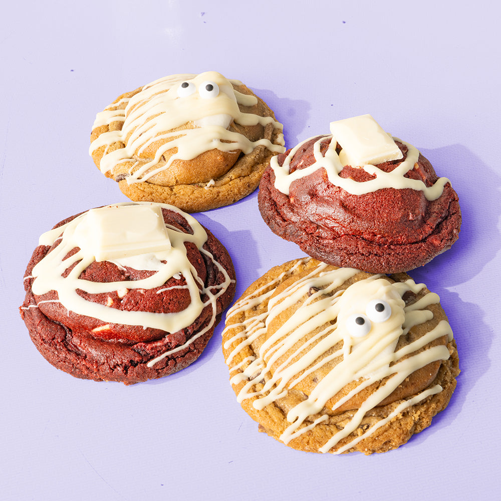 Our spookiest cookie box yet! This Halloween 4 Box includes 2 Mummy NYC Cookies and 2 Red Velvet Milkybar Cookies — the perfect mix of fun and indulgence. The Mummy Cookie is a chewy NYC-style cookie filled with gooey caramel sauce and Belgian chocolate chips, topped with a white chocolate mummy design and edible eyes. The Red Velvet Milkybar Cookie is soft and rich, filled with smooth white chocolate, and topped with a drizzle of white chocolate and a chunk of Milkybar. A hauntingly delicious combo for the Halloween season!