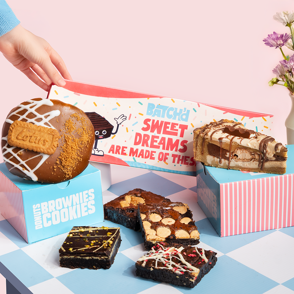This bundle includes an OG Biscuit Donut filled with creamy whipping cream, a Kinder Nutella Cookie Pie, and four indulgent brownies in Raspberry White Chocolate, Pistachio, Triple Chocolate, and Cookie Dough.