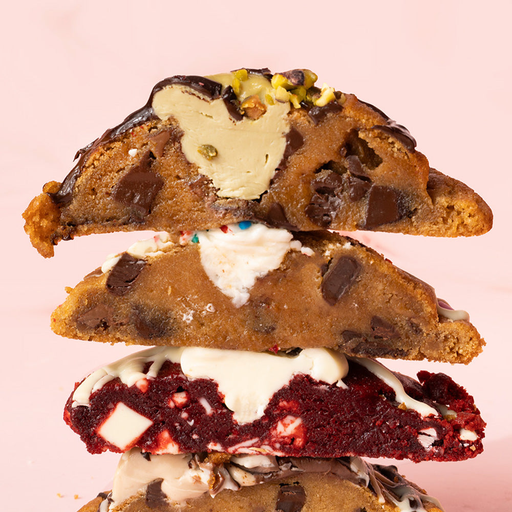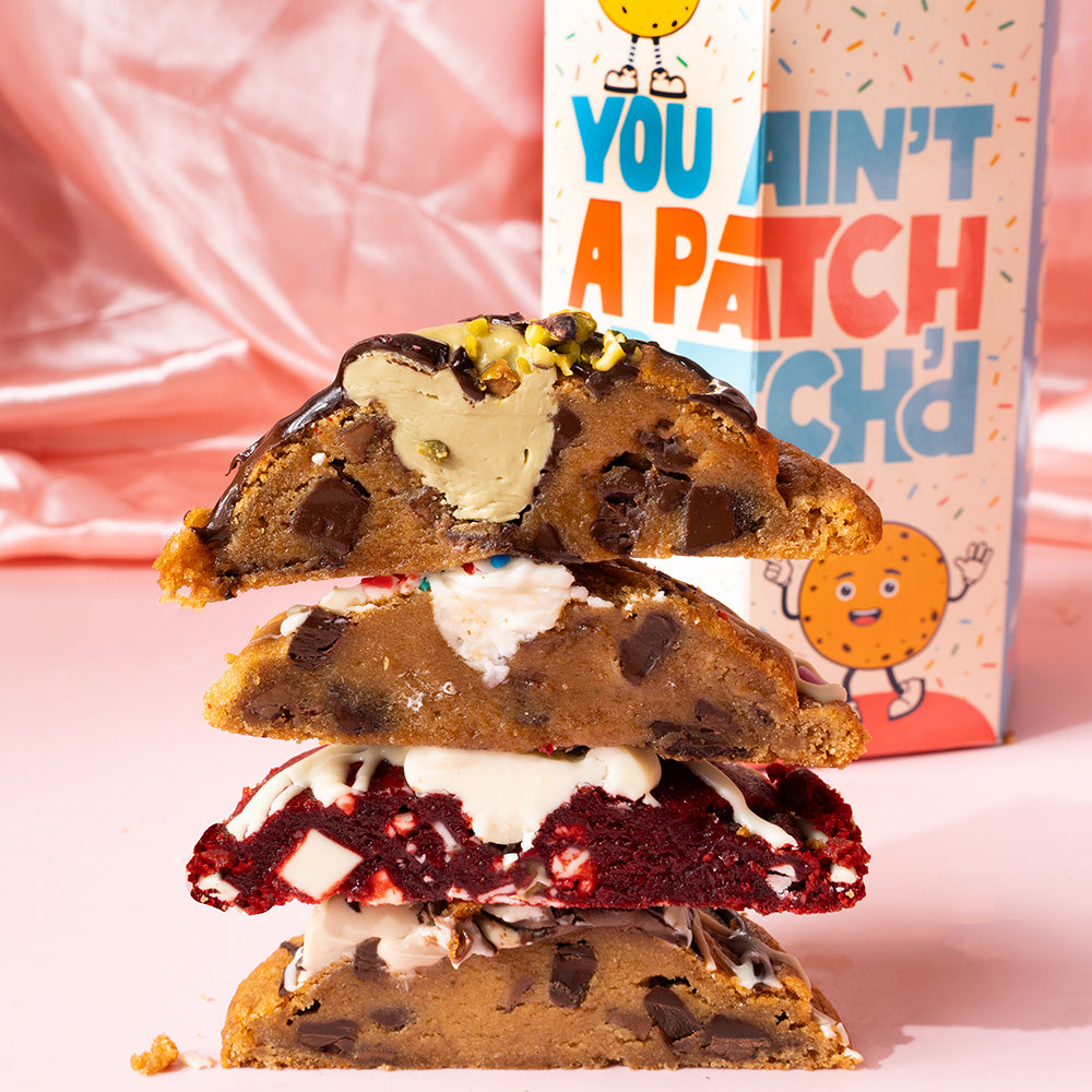 Indulge in the ultimate Loaded NY Cookies Box, featuring thick, gooey cookies packed with rich Belgian chocolate chips in four decadent flavours. The Nutella Kinder cookie blends creamy Nutella with smooth Kinder chocolate for a truly indulgent bite. The Red Velvet Milkybar cookie combines a luscious red velvet base with silky Milkybar white chocolate. The Old School Sprinkles cookie delivers a nostalgia with colourful sprinkles. The Pistachio cookie offers a luxurious mix of pistachio crème and Belgian chocolate for the perfect balance of crunch and sweetness. Perfect for gifting, sharing, or treating yourself.