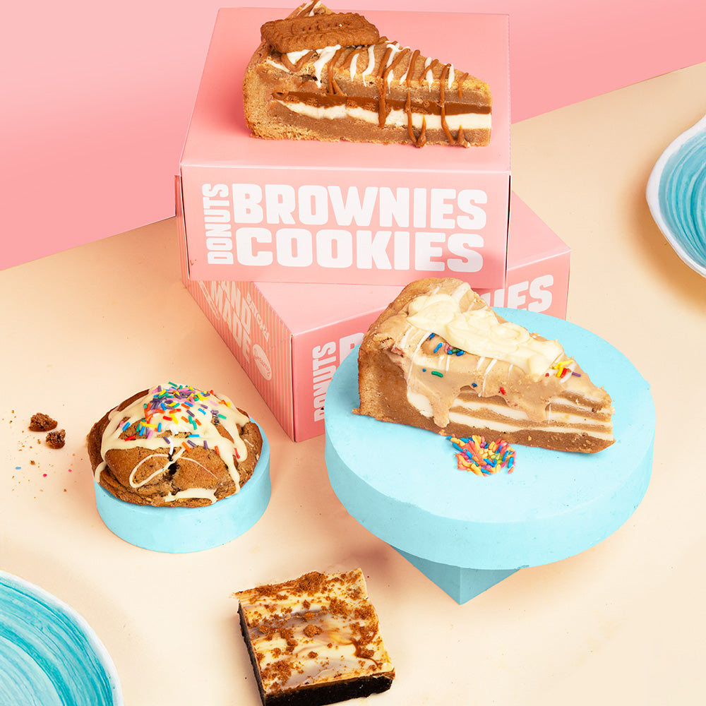 Includes an OG Biscuit Cookie Pie layered with caramelised biscuit spread and white chocolate sauce, topped with a Biscoff® biscuit. A Milkybar Kid Cookie Pie with white chocolate sauce, hazelnut sauce and Milkybar Kid chocolate. An Old School NYC Cookie with Belgian chocolate chips, white chocolate sauce and rainbow sprinkles. And an OG Biscuit Brownie topped with Biscoff® spread, white chocolate sauce and Biscoff® crumb.